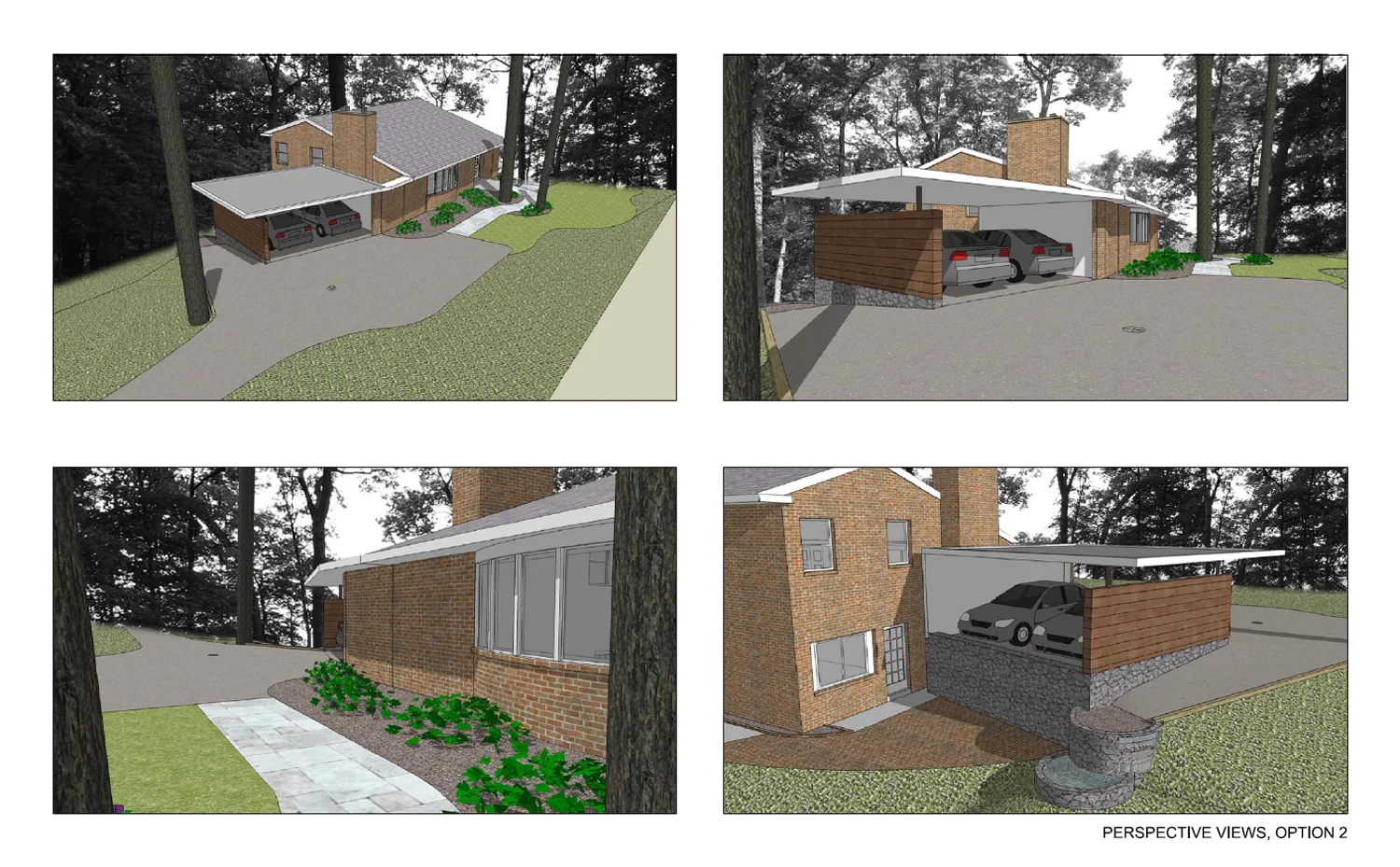 The clients were looking to provide vehicular cover at their simple brick home on a beautiful wooded lot in suburban Philadelphia. Alternate solutions were developed using a variety of materials and degrees of enclosure that complemented the lines of their home, yet created the more modern impression they desired. Phase II will be to continue the selected design language to the bay window and entry of the home.